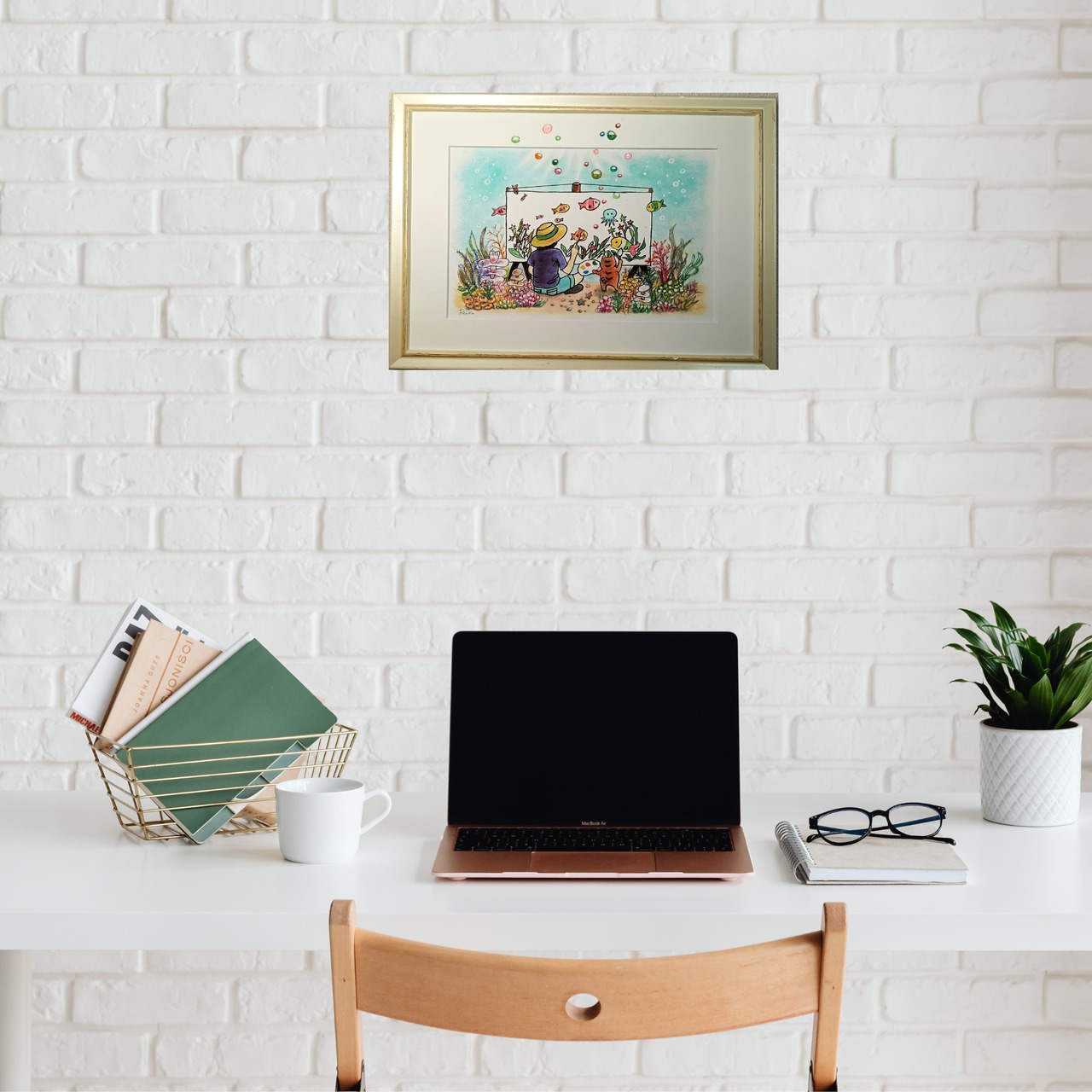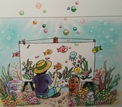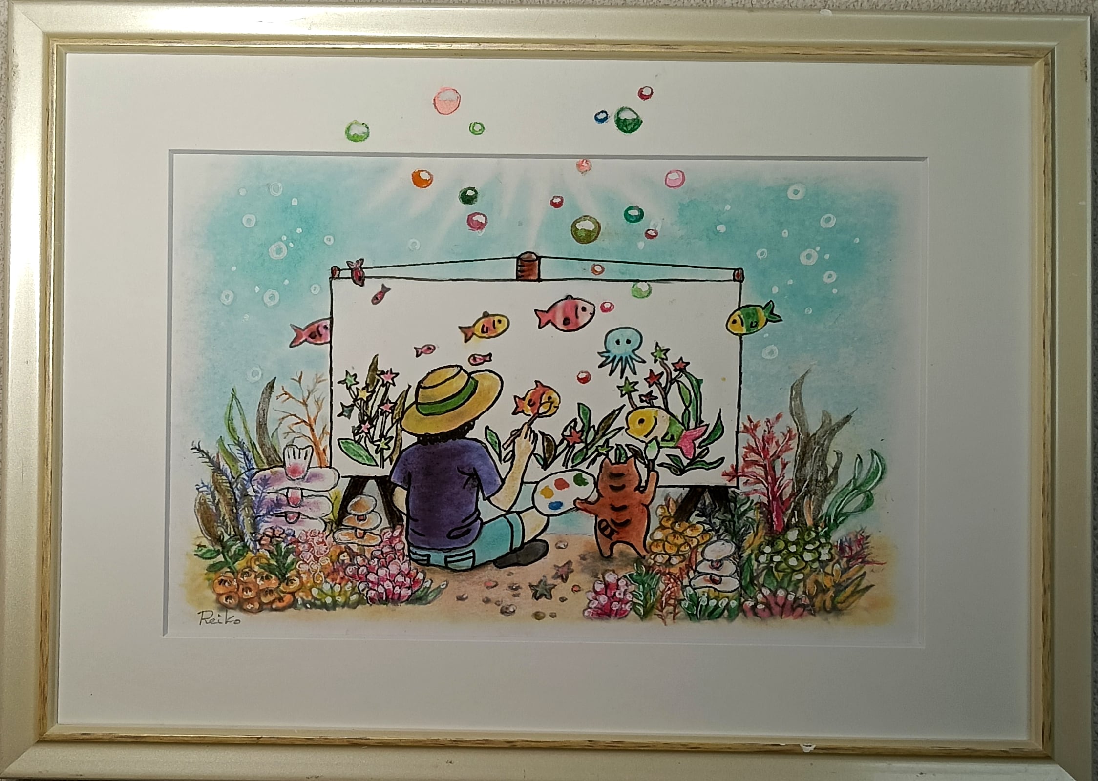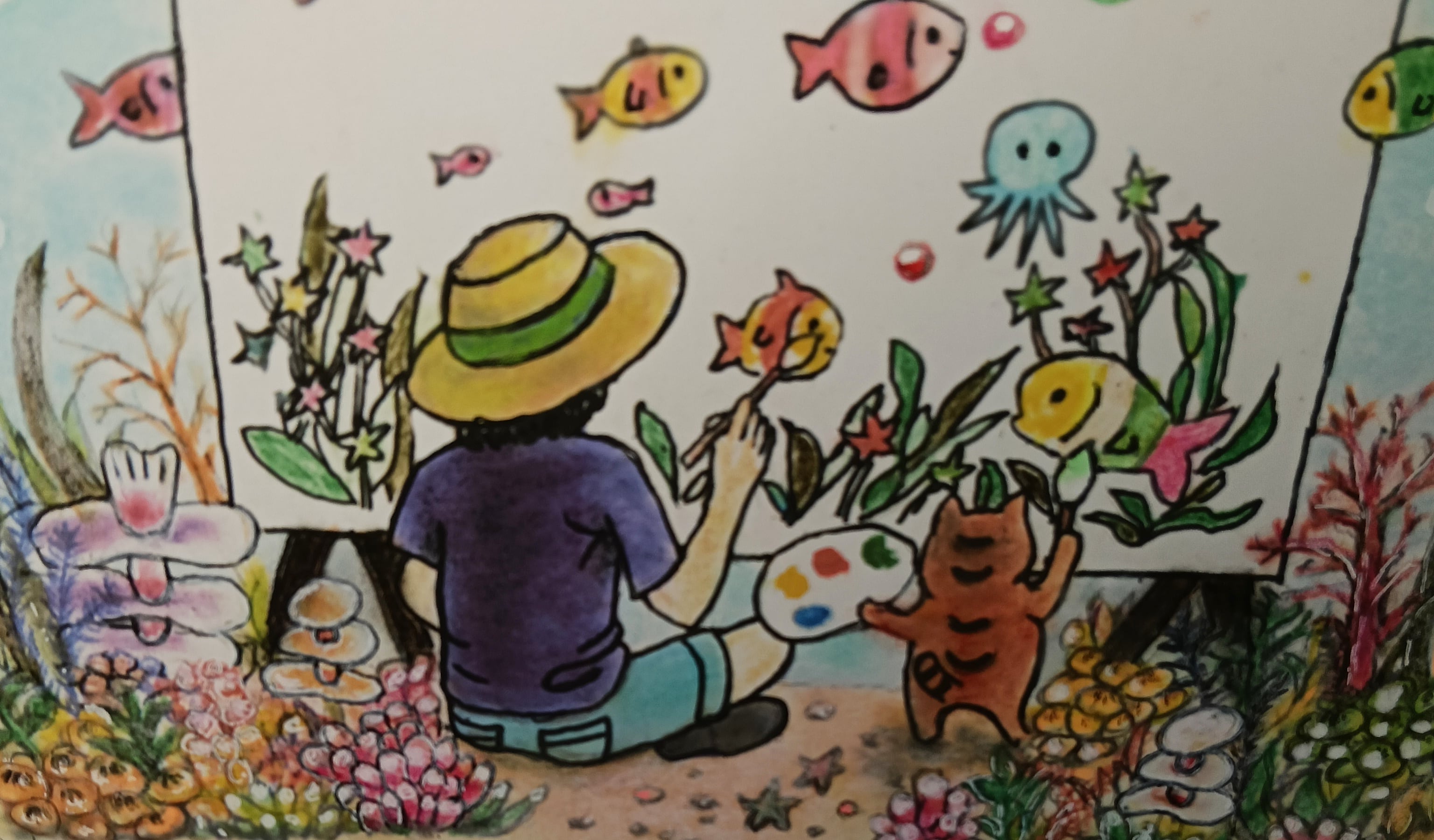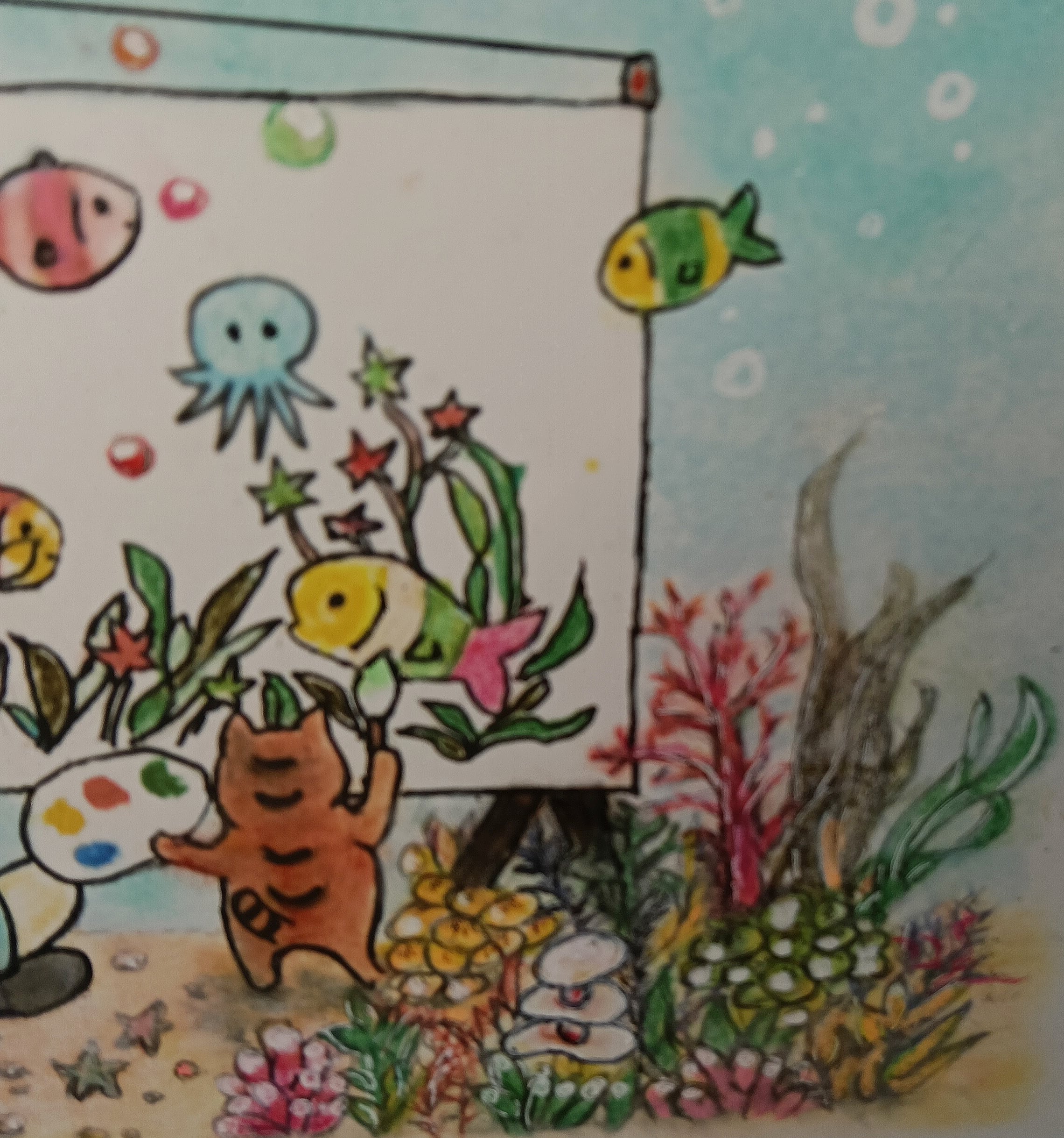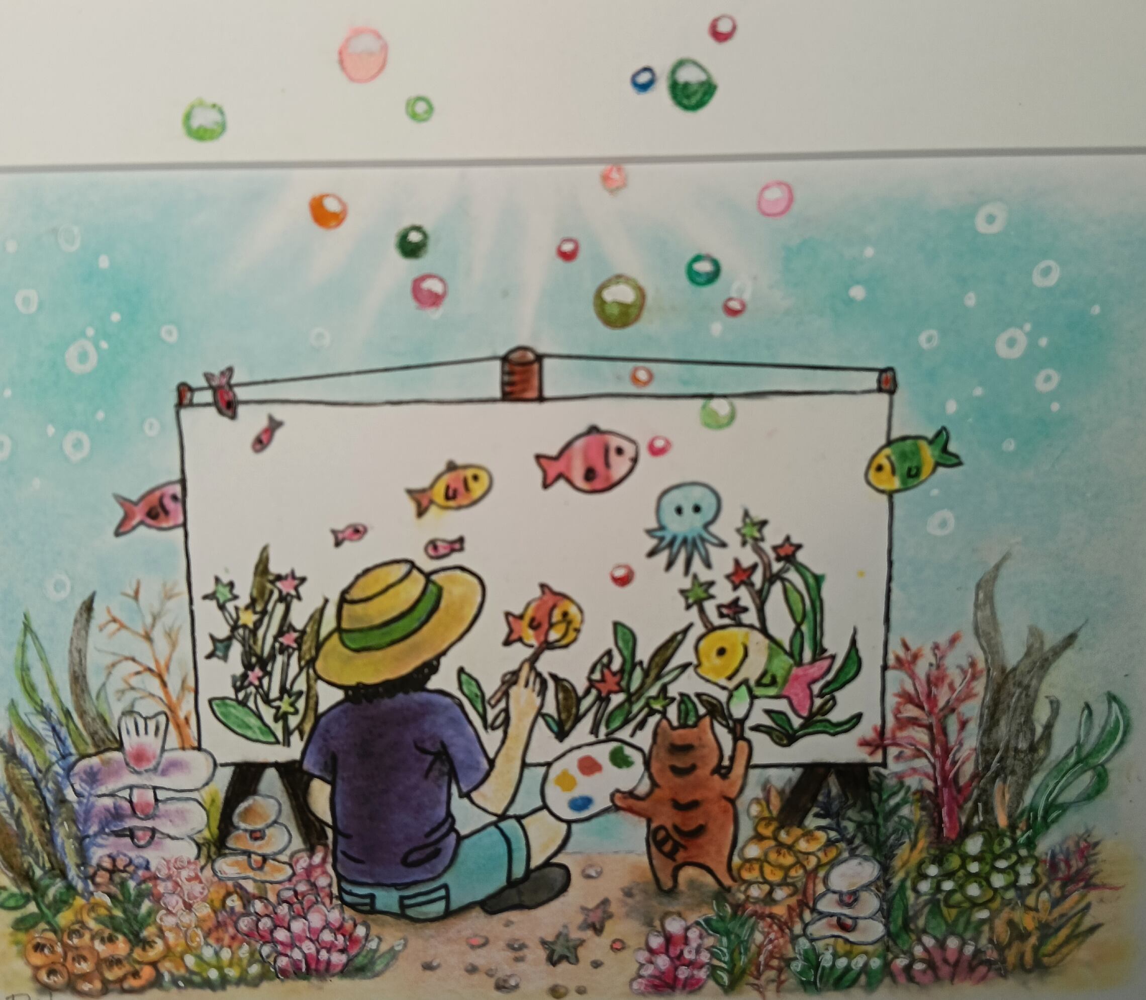 「何を描いているのかな?」と覗き込む魚たちの瞳も、楽しそうです。