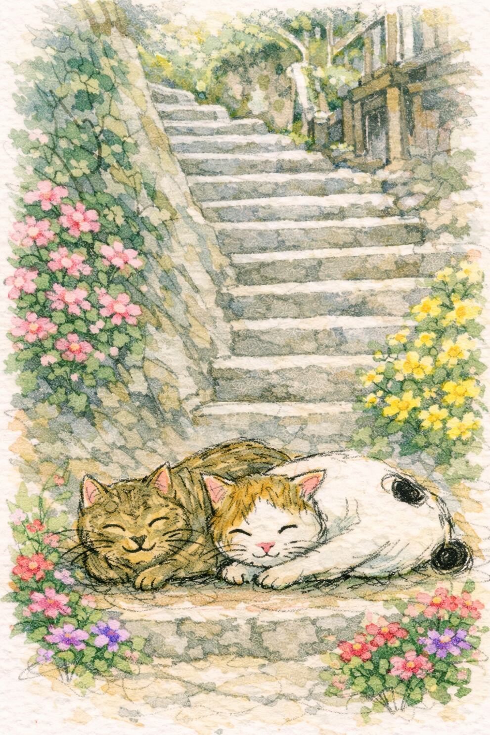 3.猫たちの憩いの場「猫の細道」です。情緒あふれる古い石段。のんびりとお昼寝する猫た