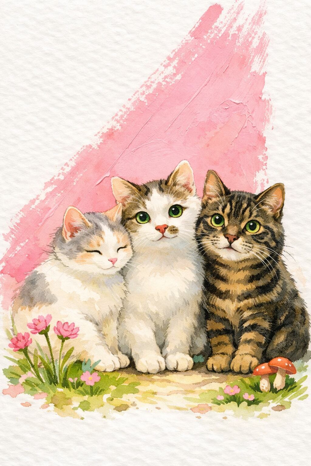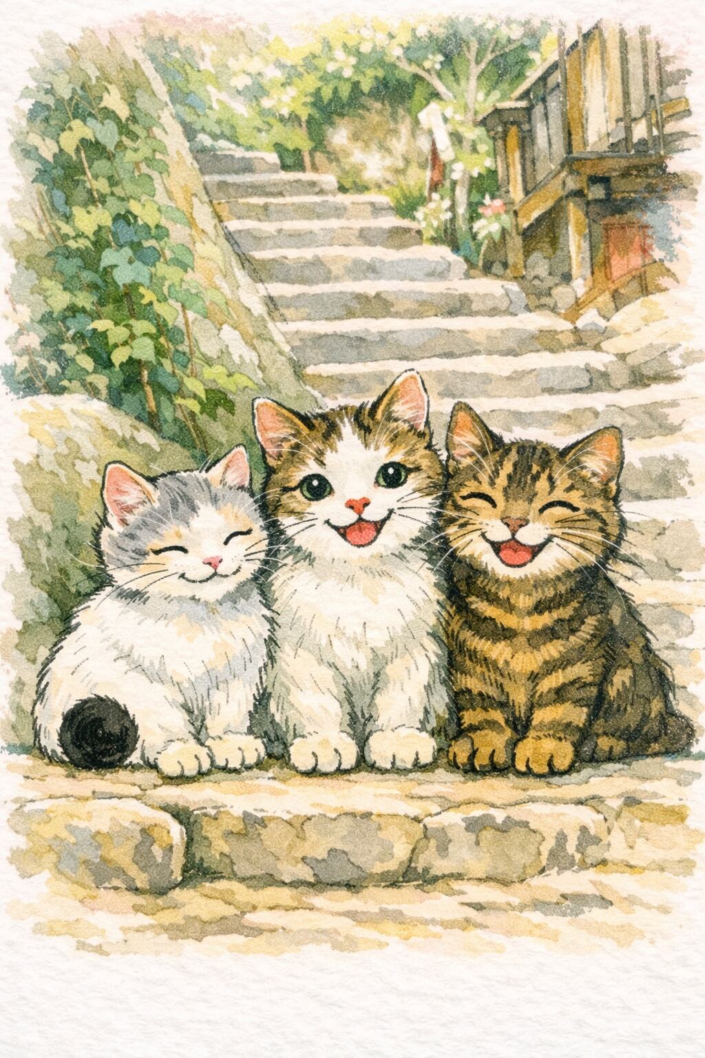 2.3匹がにっこり笑っている石段は、猫たちの憩いの場「猫の細道」です。情緒あふれる古い石段。いつも、猫に会える場所です。