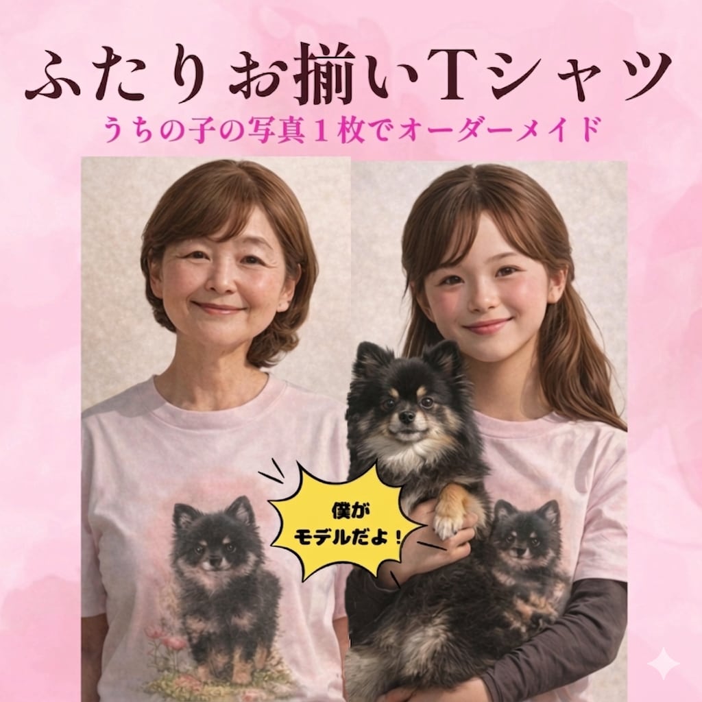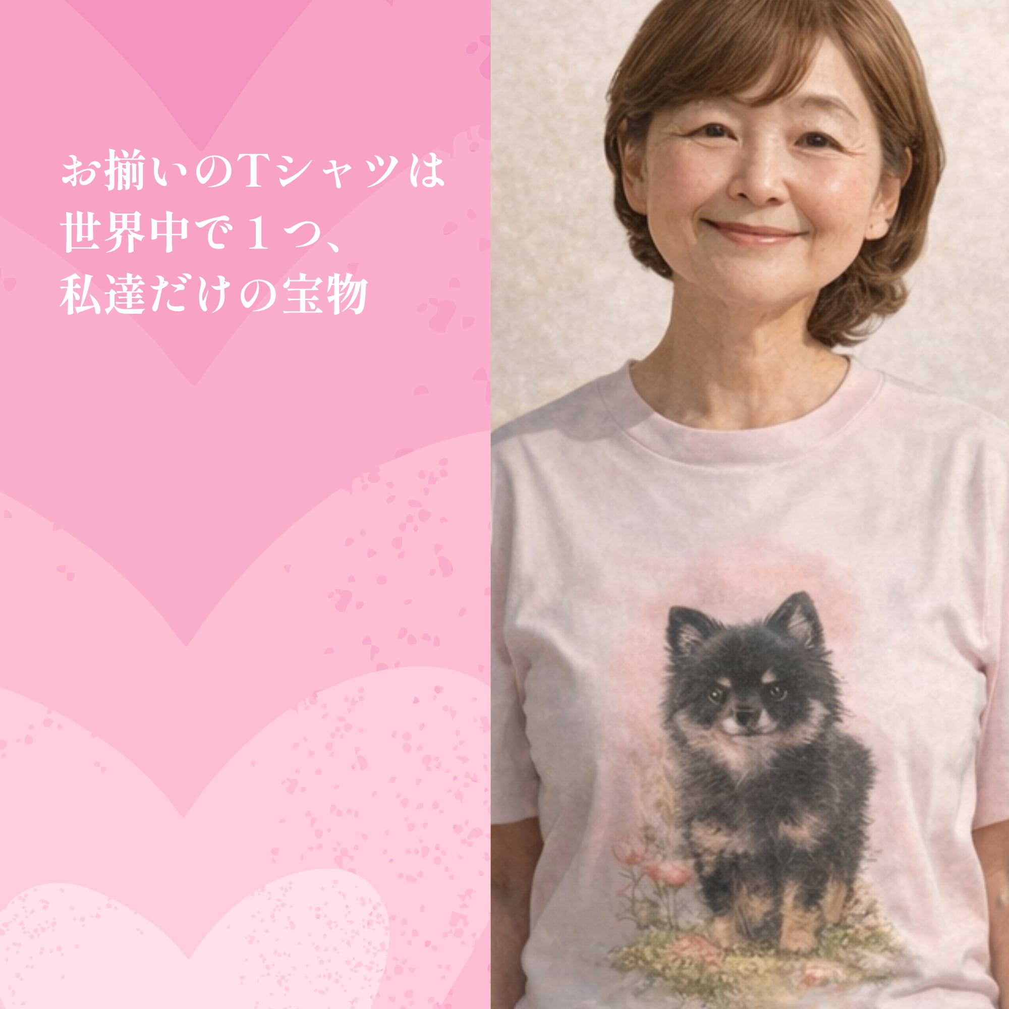 だから、誰でも気楽に着られるTシャツで、「うちの子(ペット)」を真ん中にして、温かな「つながり」を感じるって素敵!そんな思いで、このセットを作りました。