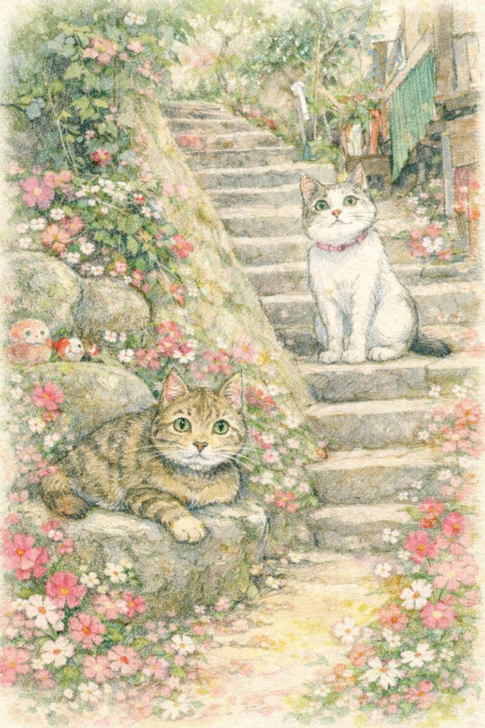 3.猫たちの憩いの場「猫の細道」です。情緒あふれる古い石段。のんびりとお昼寝する猫た