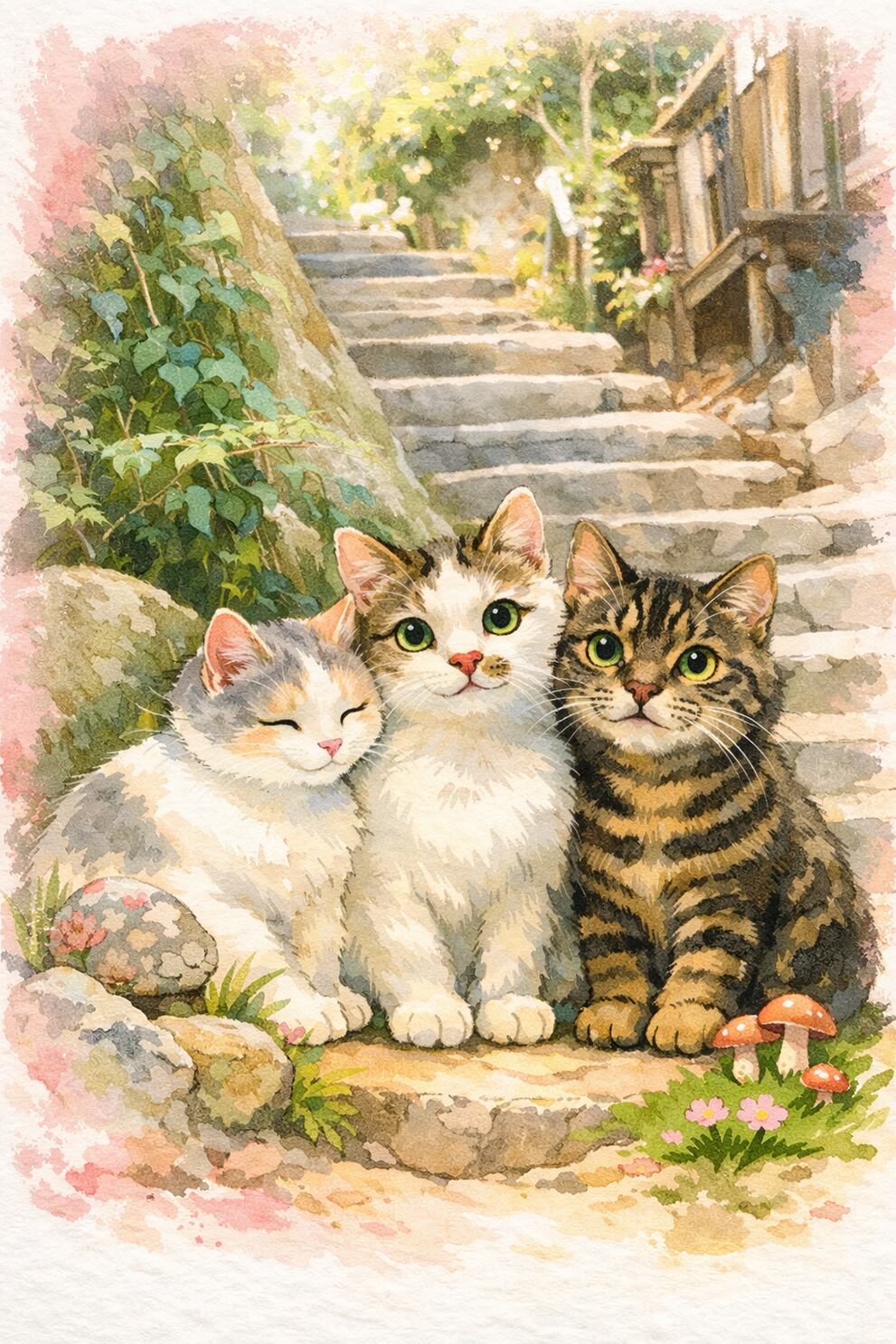 3.猫たちの憩いの場「猫の細道」です。情緒あふれる古い石段。のんびりとお昼寝する猫た