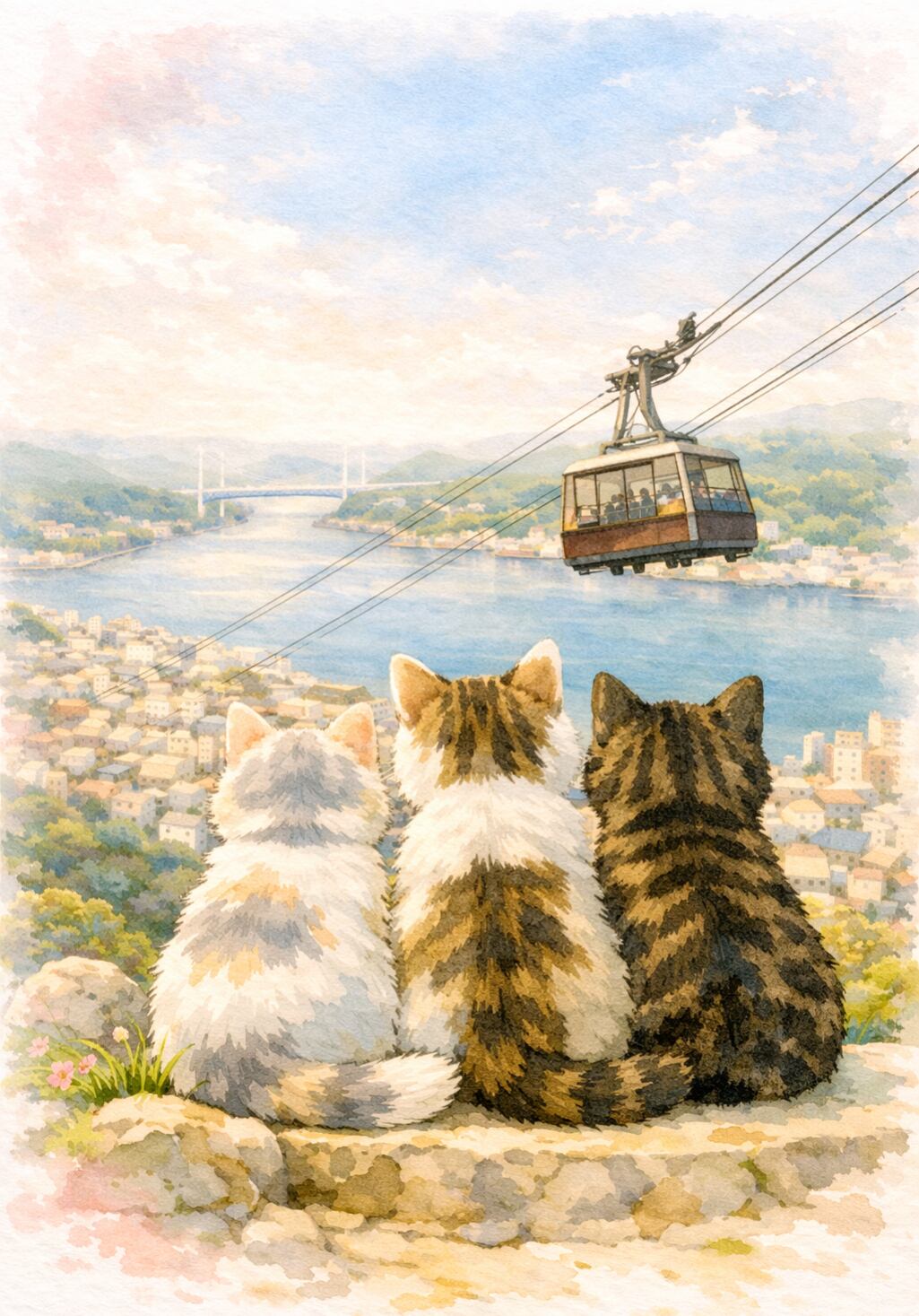 2.千光寺山へ続く「ロープウェイ」山頂からの風景と、ゆったり進むロープウェイ。